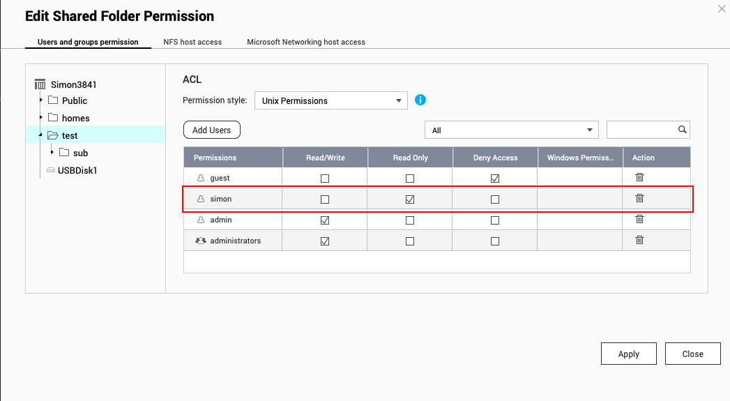then remove "Everyone" permission from root share acl permission and Assign to the desired Windows permission to the user, for examplet Read only permissions for the acl permission. Like this (in our example root shared is “test” and the user is “Simon”)