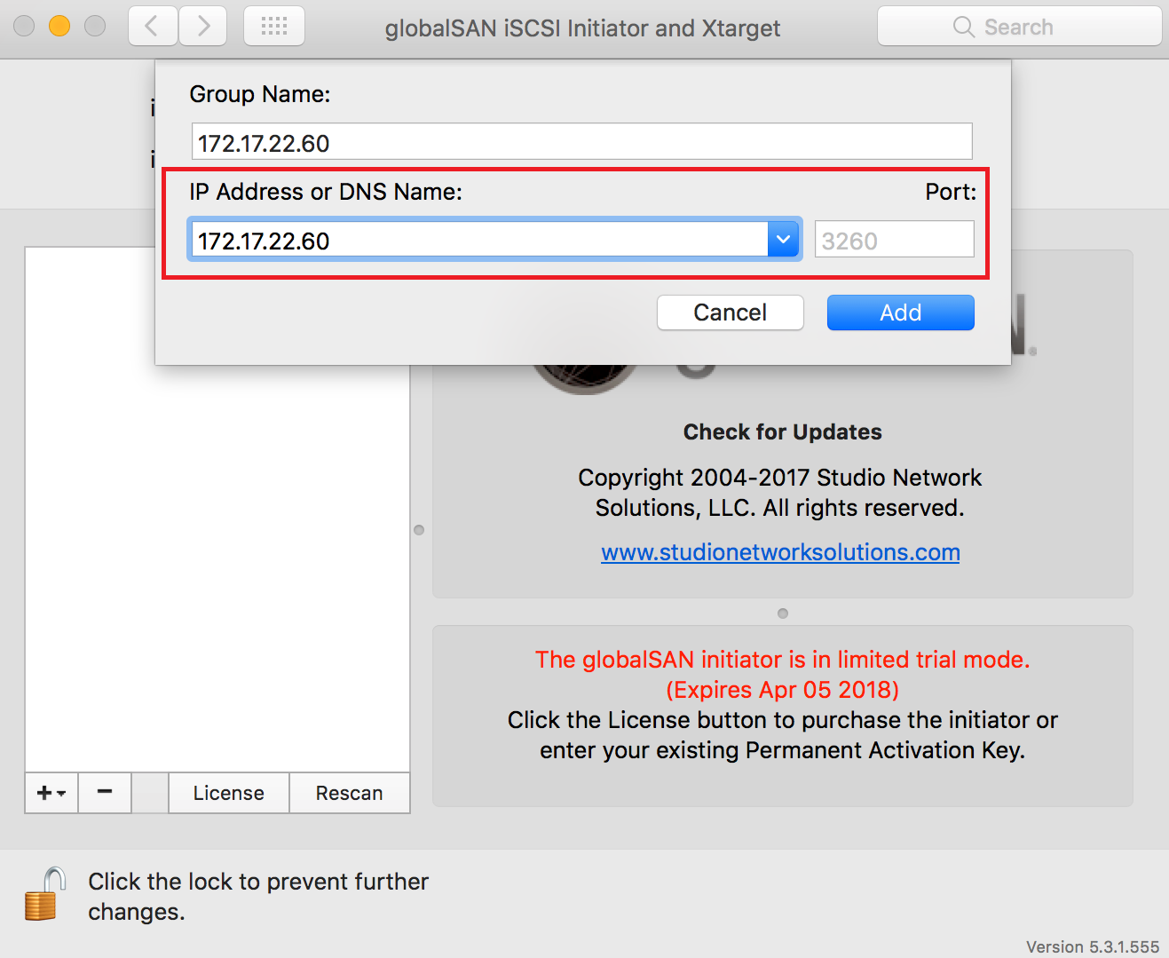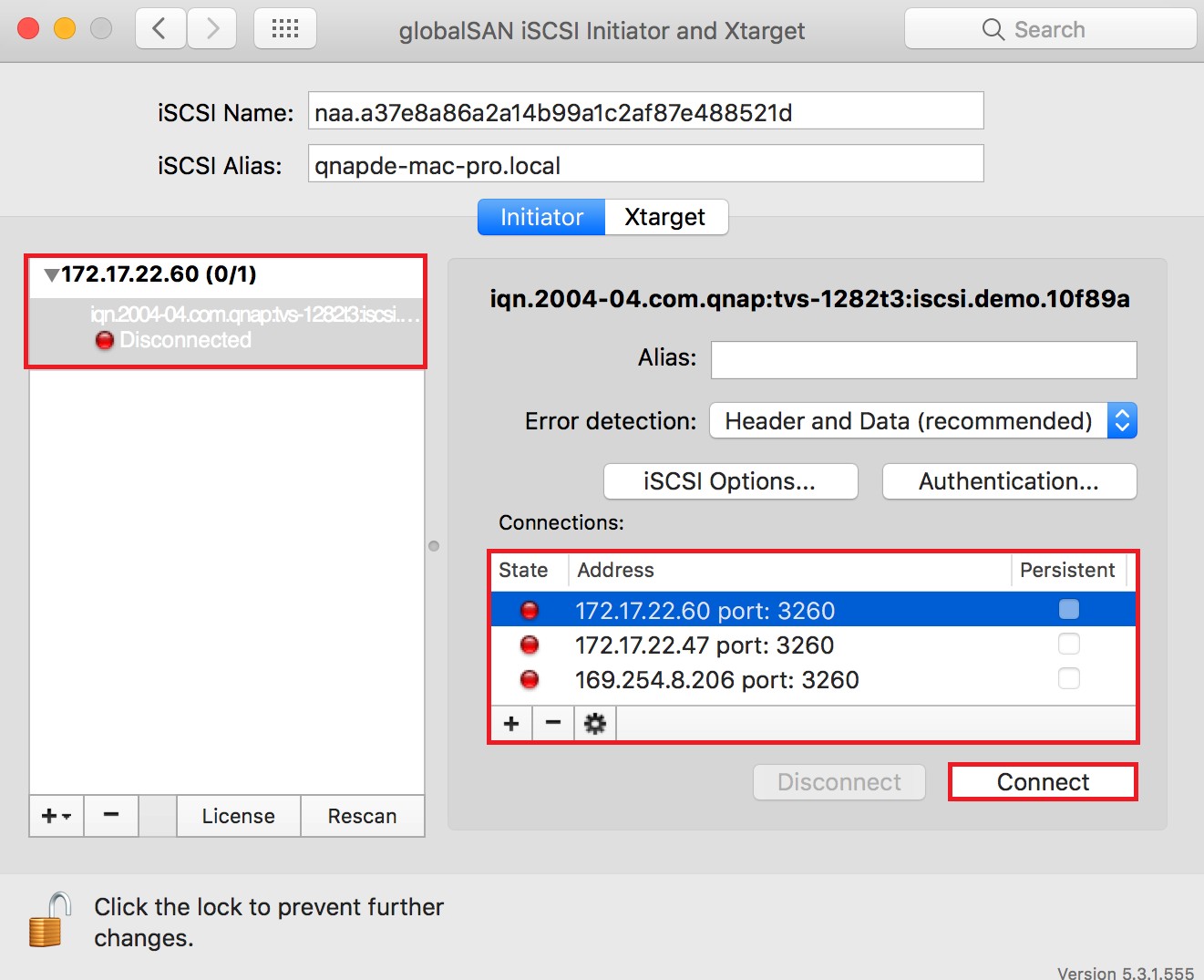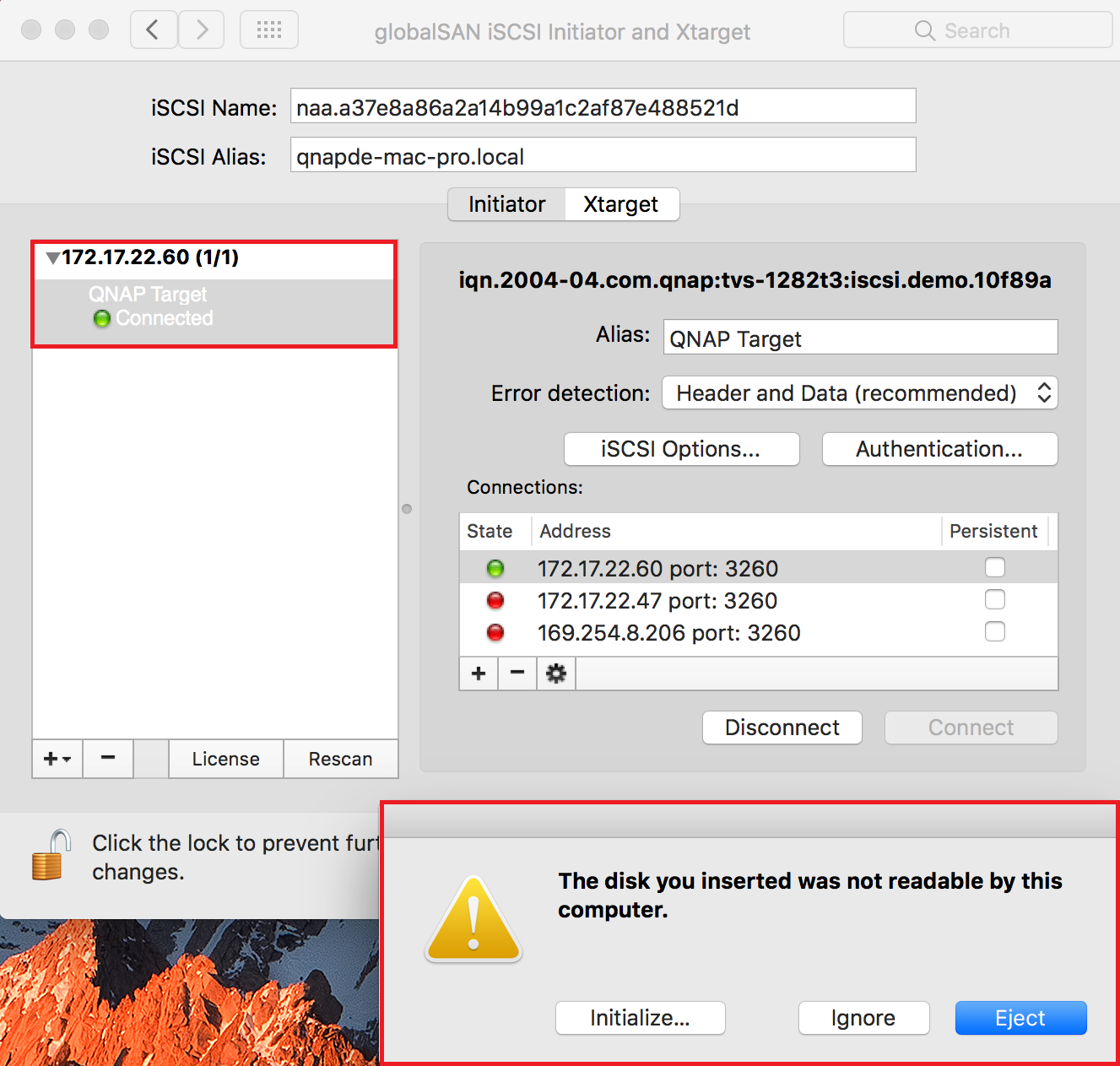 Connecting to an iSCSI target using globalSAN iSCSI initiator in Mac OS