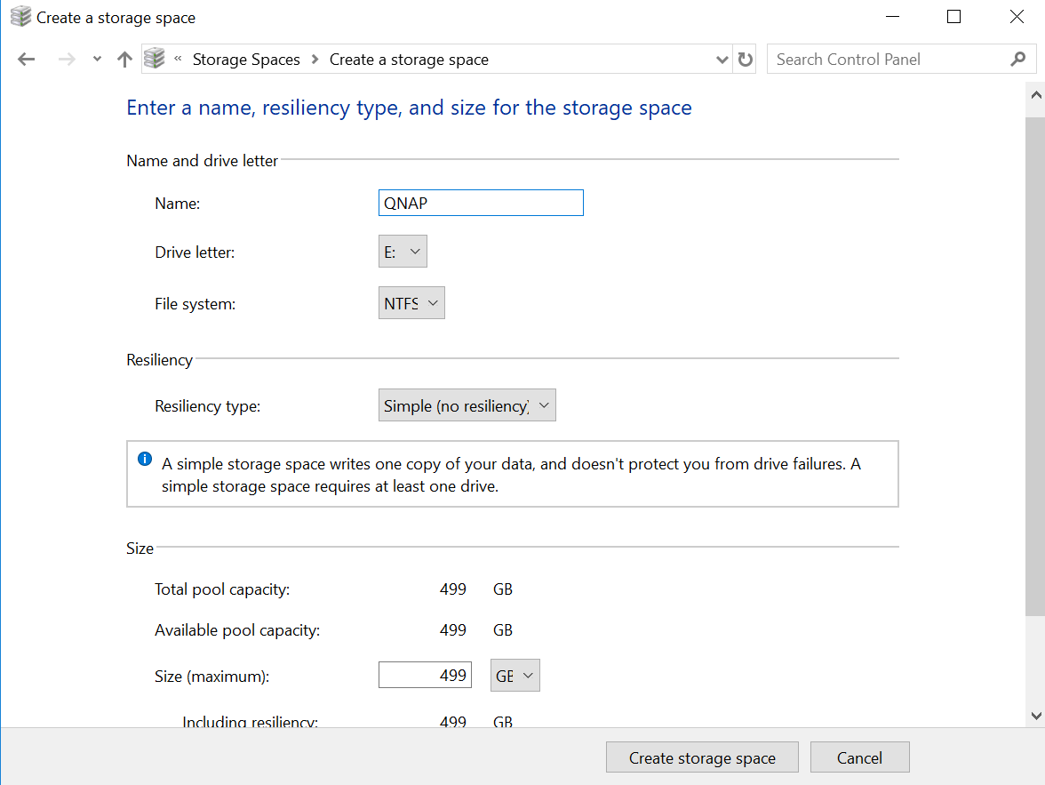 5. Specify the pool formatting options, and then click Create Storage Space.