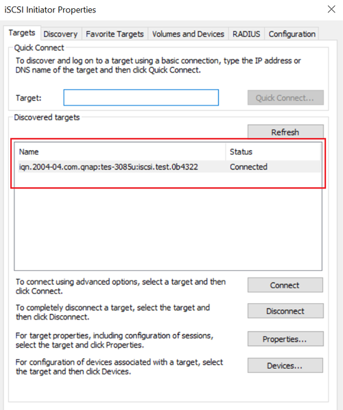 If you configured CHAP authentication on the NAS, then the target will have the status Inactive. You must specify the CHAP username and password to connect.