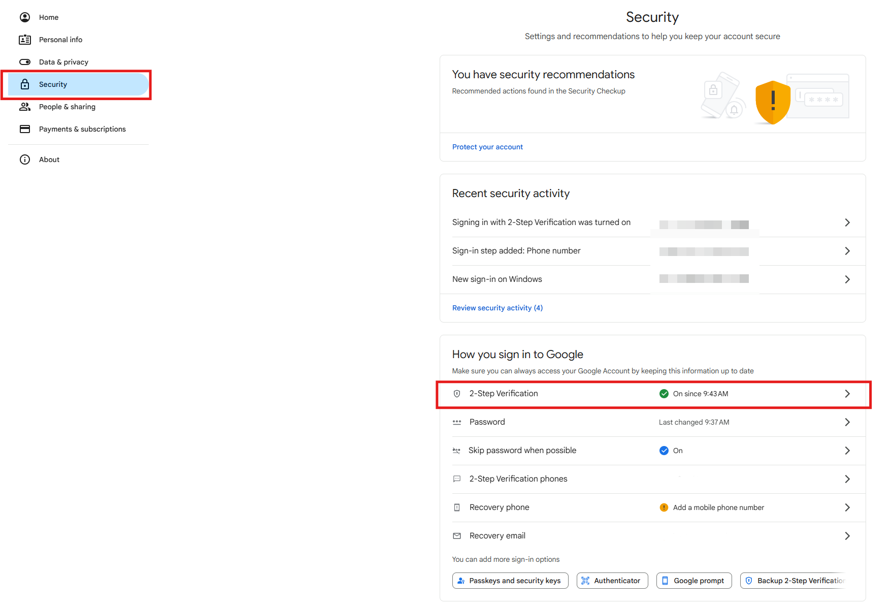 2. 打开您的 Google 账户安全设置