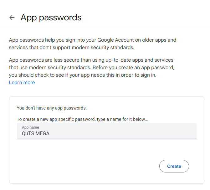 Gmail enforces security measures such as two-factor authentication (2FA) and blocks sign-in attempts from apps it considers less secure. As a result, QuTS MEGA cannot authenticate using your standard Gmail password.