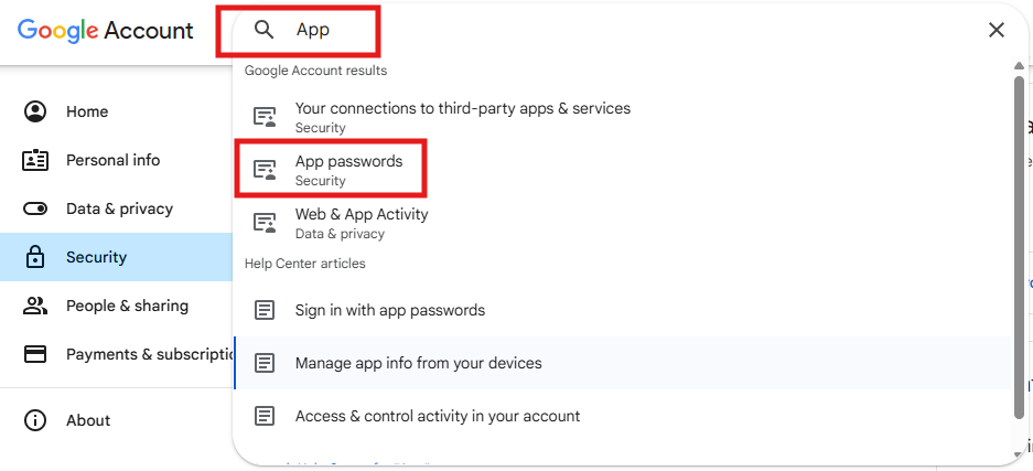 - Select App passwords from the search results.