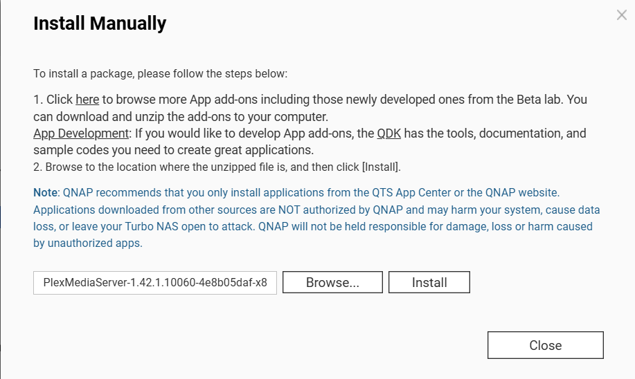 Plex Media Server can be installed from the QTS App Center to enable multimedia streaming and management on your QNAP NAS. While QNAP regularly updates the Plex package in collaboration with Plex, new features or fixes may be released on the Plex website before they appear in the App Center. If you want to access the latest Plex version without waiting for the App Center update, you can manually download and install the newest Plex package on your NAS.