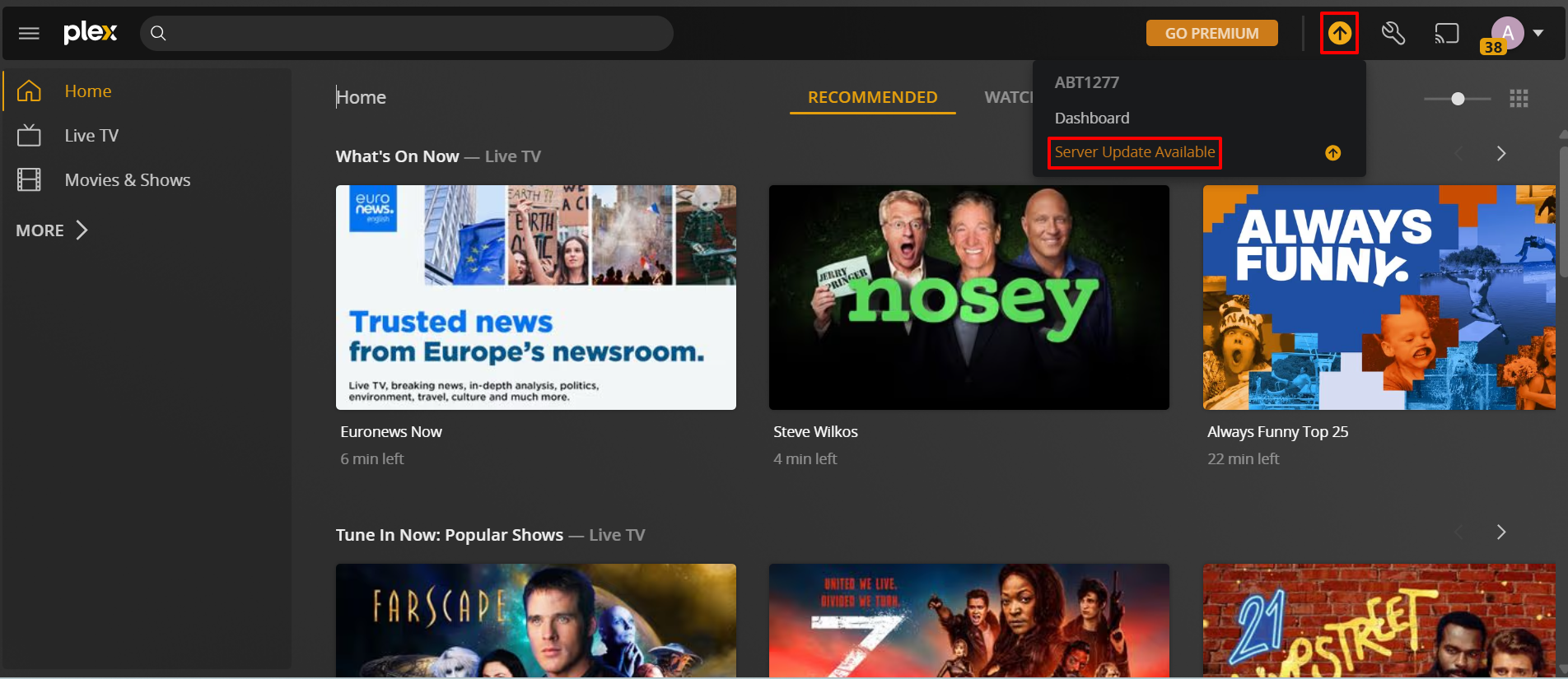 - 在 Plex Media Server 网页界面中,点击活动图标在应用程序的右上角,然后点击服务器更新可用如果有新的更新包可用。
