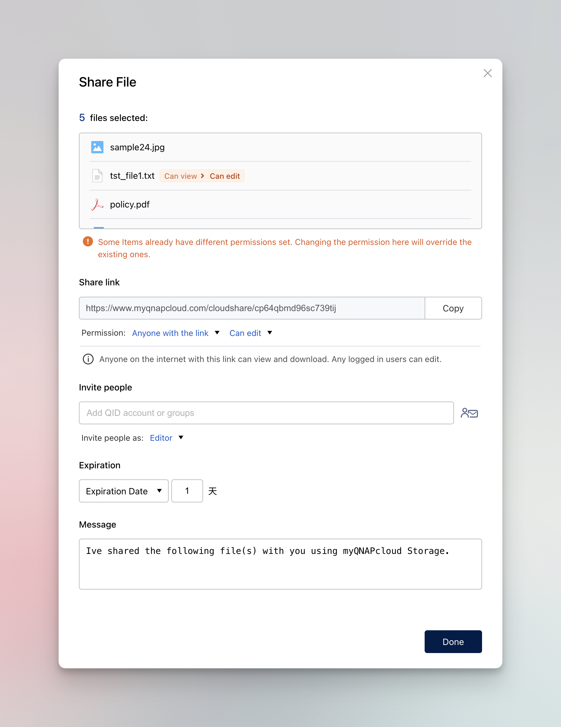 您可以通过配置每个文件或文件夹的权限设置来控制谁可以访问内容以及他们可以执行的操作。您可以在用户列表中授予QNAP ID可查看或可编辑权限。您还可以在任何人持有链接和仅受邀QNAP ID之间更改共享权限。