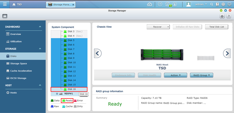 Ex: In the picture below, there is a RAID 6 (Disk5 - Disk15) group and Disk16 is the hot spare disk.