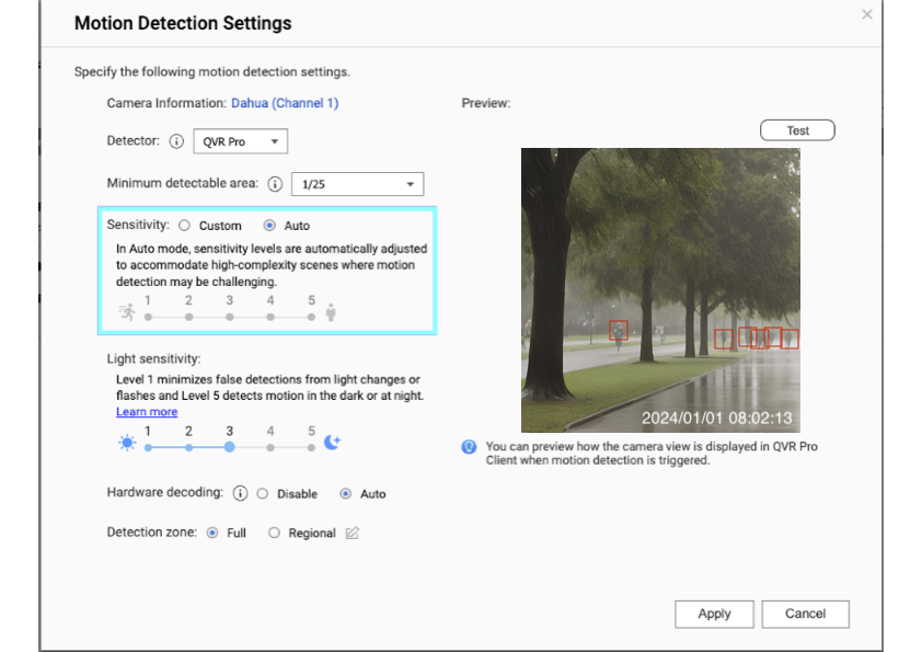 Sensitivity (Auto mode): Sensitivity levels are automatically adjusted to accommodate high-complexity scenes where motion detection may be challenging.