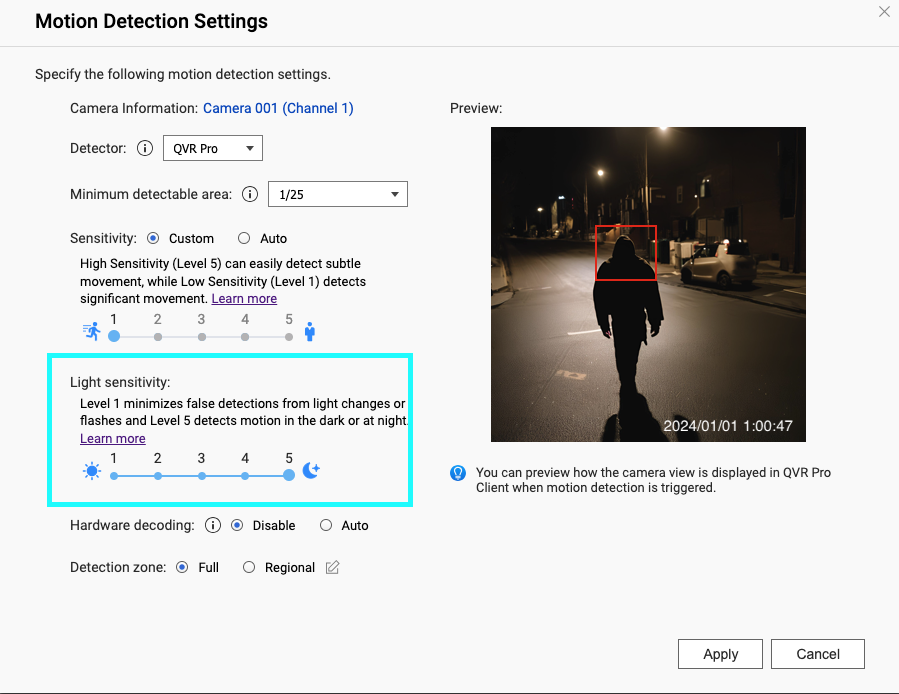 Light Sensitivity: High light sensitivity allows you to detect motion in dark areas or at night, whereas low light sensitivity can minimize false detections such as light changes or flashes.