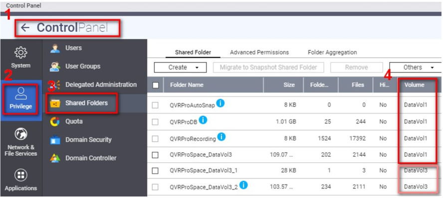Note: You can check the [Shared Folders] list to find the volumes where the relevant QVR Pro folders are located.