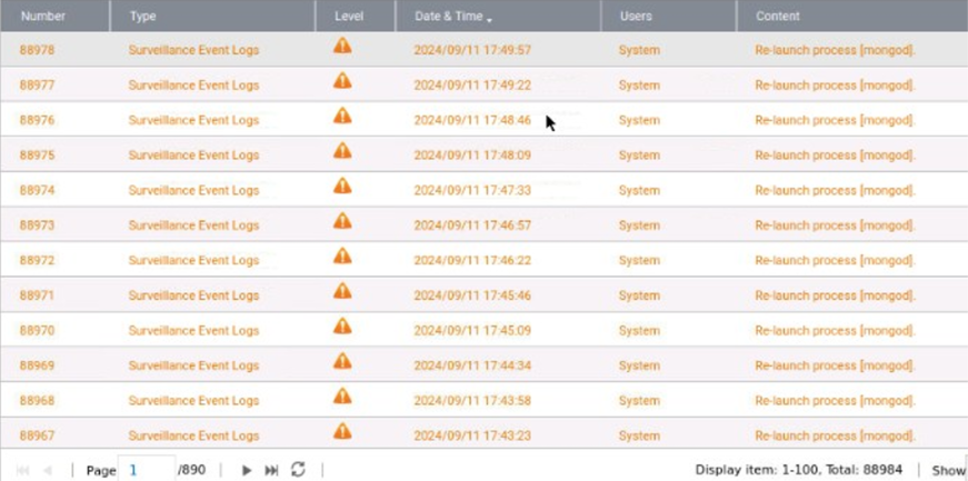 Then check the QVR Pro logs to see if any new “Re-launch process [mongod]” warning messages appear. If there's no more new warning message, this indicates that the QVR Pro database issue has been resolved.