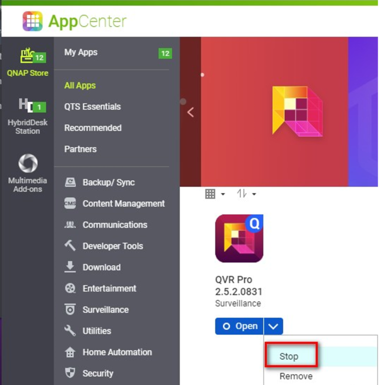 4. After it, please navigate to NAS App Center > QVR Pro and to restart it by clicking on Stop and then Start button.