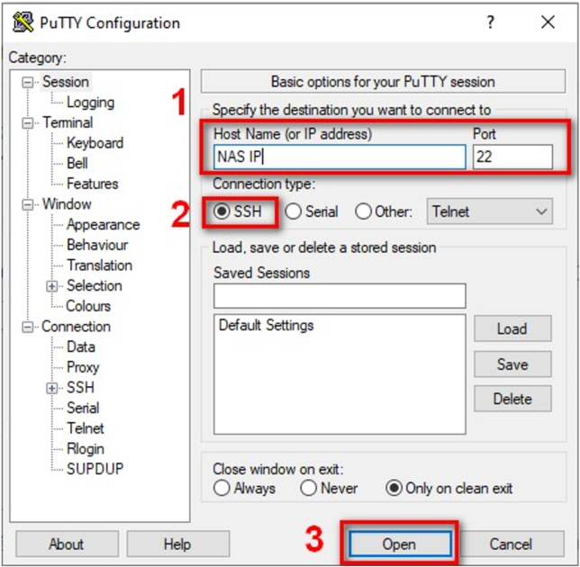 - Open the PuTTY utility, enter the NAS IP address and port (default is port 22). Click "Open" and log in to the NAS console using the NAS admin username and password.