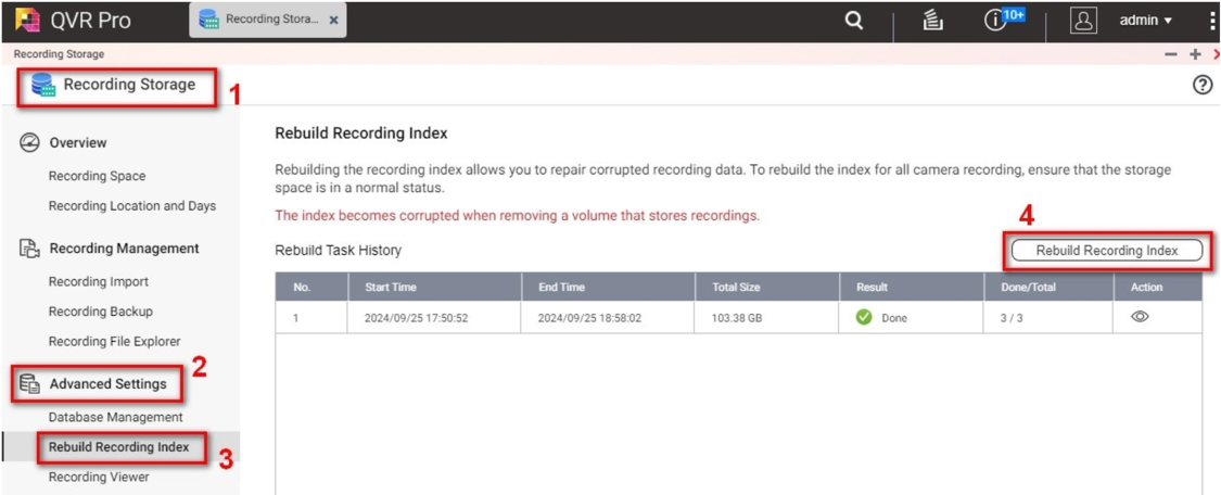 6. After completing the above commands, please navigate to the QVR Pro app > Recording Storage > Advanced Settings > Rebuild Recording Index to perform the "Rebuild Recording Index" to restore all recording data.
