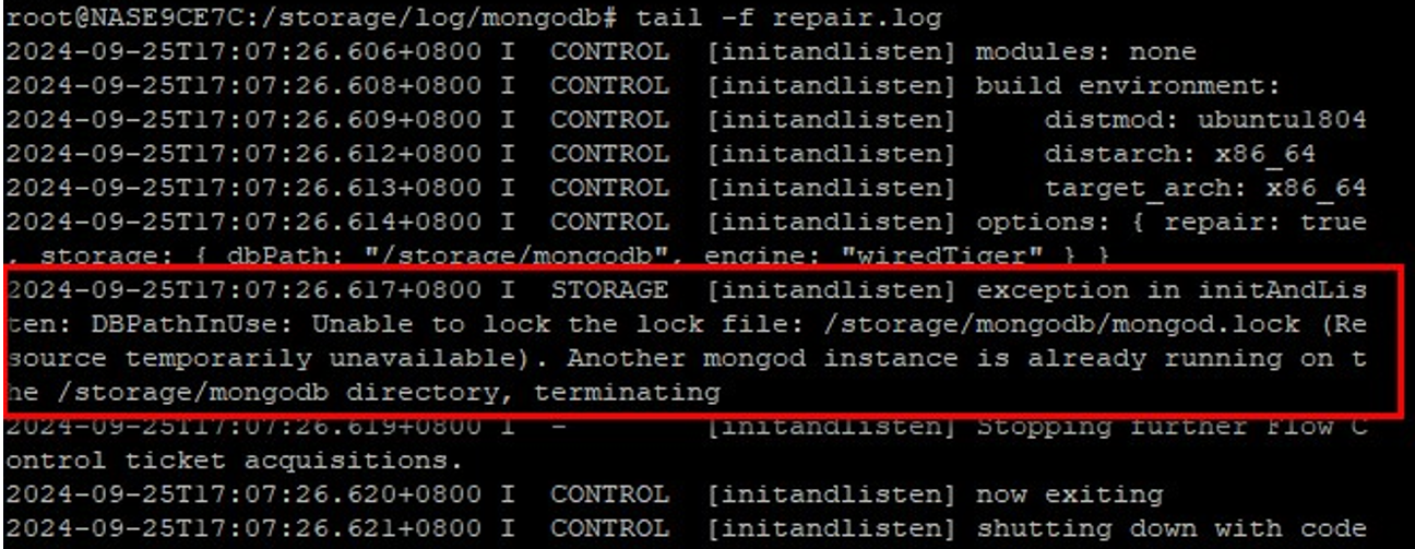 5. If all the steps above are performed but the "Re-launch process [mongod]" warning message still continues appearing, this indicates that the mongod database repair has failed. In this case, In this case, please follow steps below to remove the damaged mongod database and rebuild it.