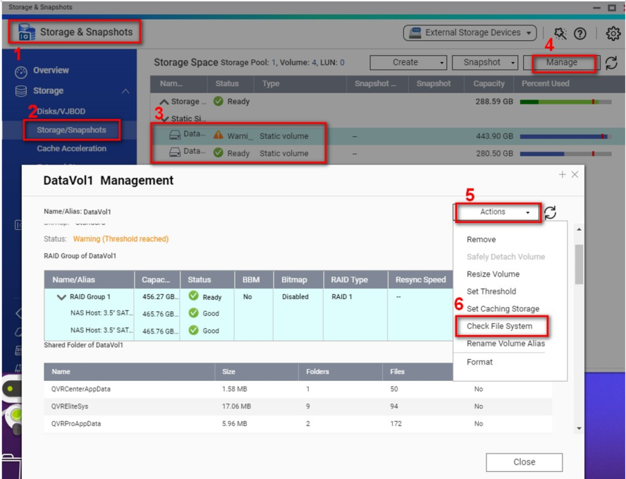 1. Perform the [Check File System] function for all volumes related to QVR Pro.