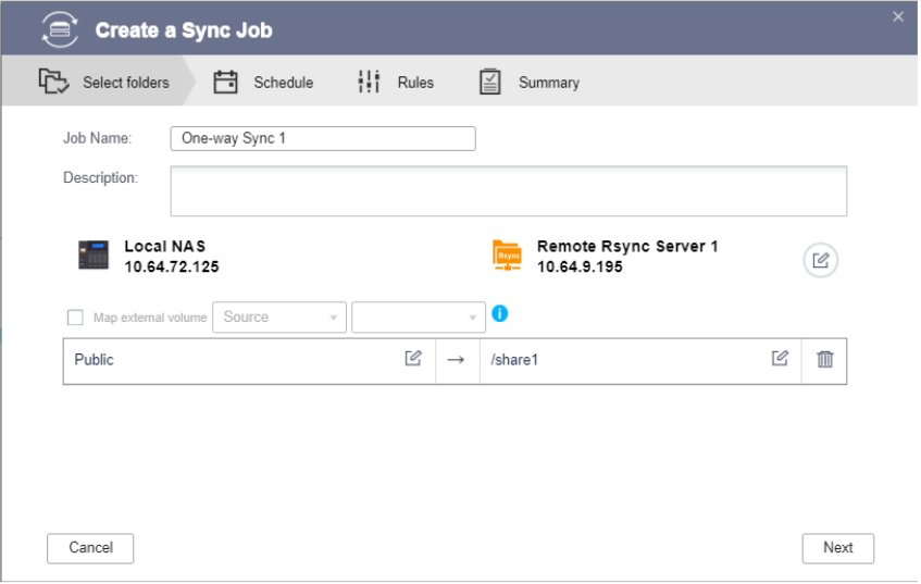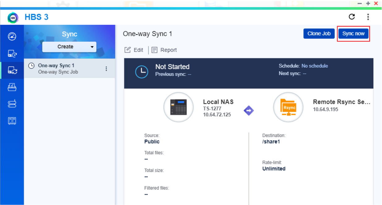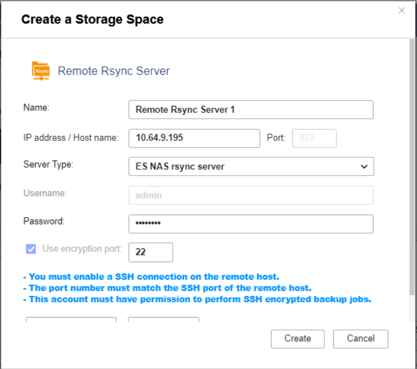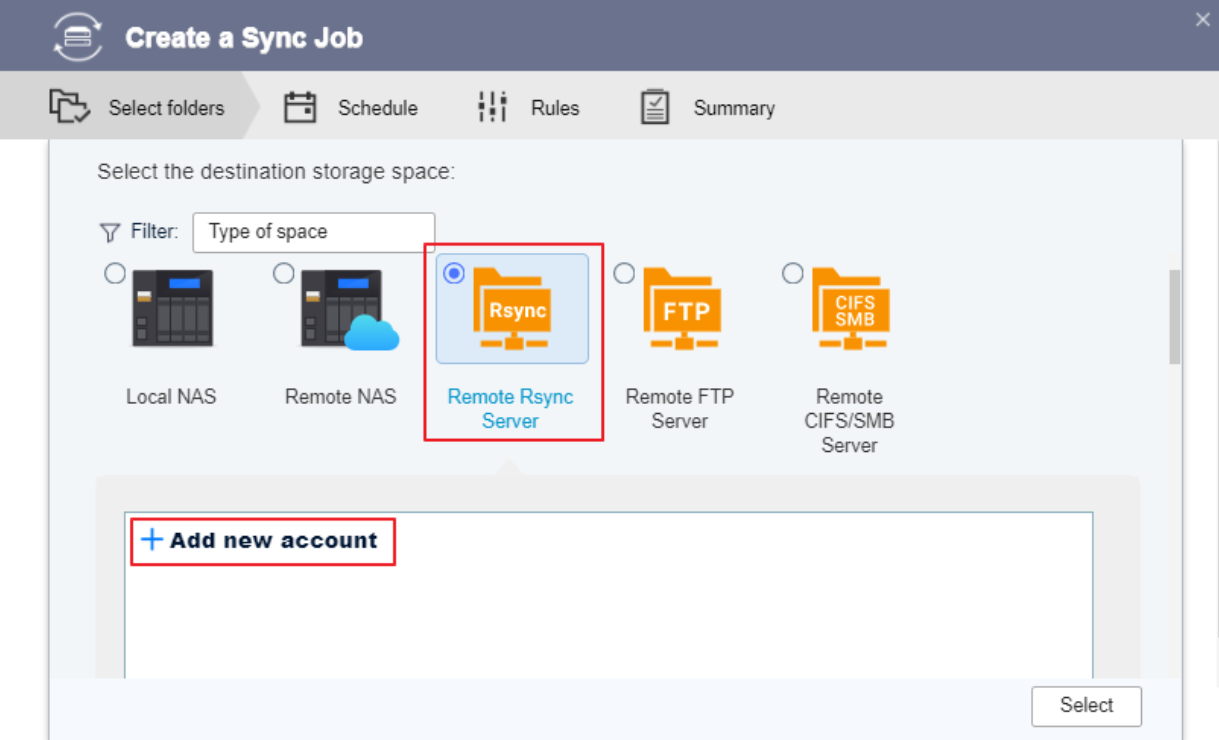 - Go to Hybrid Backup Sync >> Sync >> Create >> One-way Sync Job >> Create a Sync Job, choose Remote Rsync Server and then click on Add new account create it.