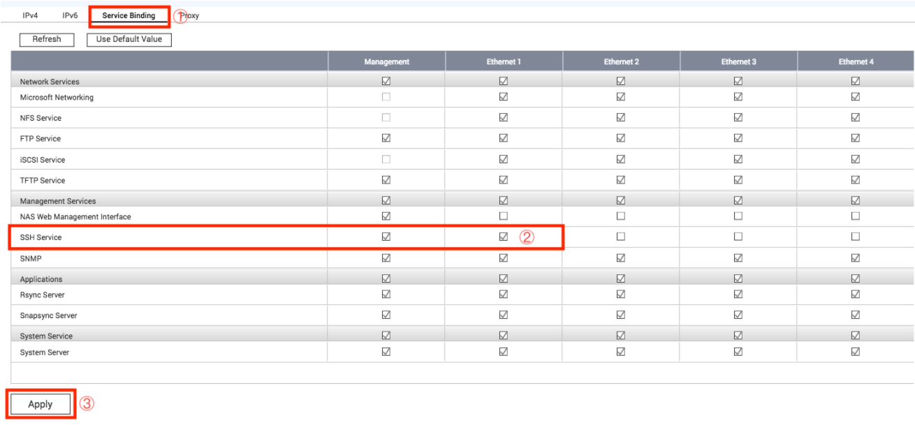 c. Remember to enable SSH Service on the port that you plan to do the sync in Control Panel >> System >> Network >> Service Binding > SSH Service and apply it