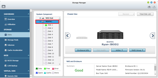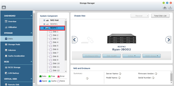 To replace an REXP series expansion unit with a new one, simply power off the Turbo NAS and disconnect the expansion unit from the Turbo NAS. Then connect the new one. However, if you want to sort the expansion units in an ascending order, please use the following methods.