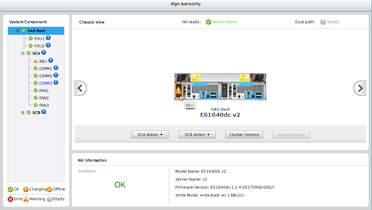 The ES NAS is a dual controller system, where both controllers are equipped with a BBU. If the system detects that one BBU has failed, the BBU of the other controller will protect cached data written on both controllers. In such cases, there will not be any direct impact on system performance. However, if both BBU fail, the ES NAS will write data directly onto the HDD to protect data. This will affect system performance.