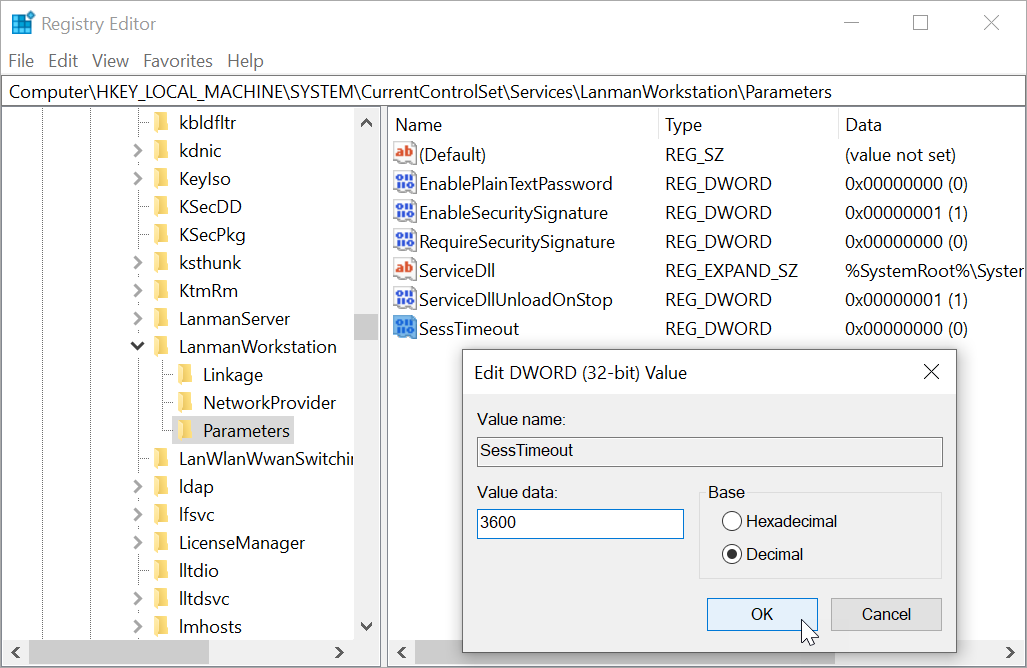 2. Go to HKEY_LOCAL_MACHINE\SYSTEM\CurrentControlSet\Services\LanmanWorkstation\Parameters.