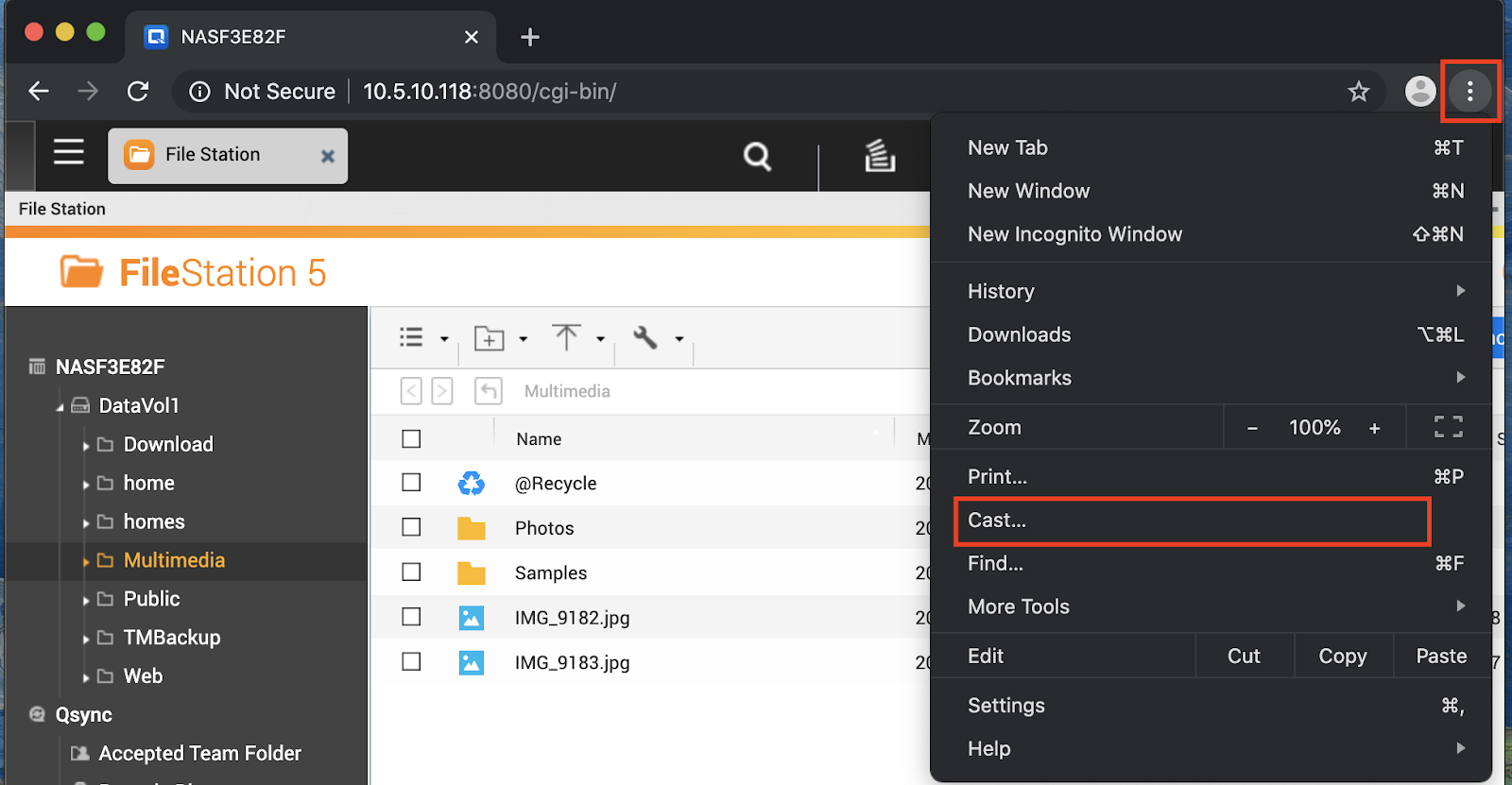 3. Simply open File, Photo, Music or the Video Station apps, select the file(s) you would like to stream and hit the cast button in the top right corner of the window as shown in the picture below.