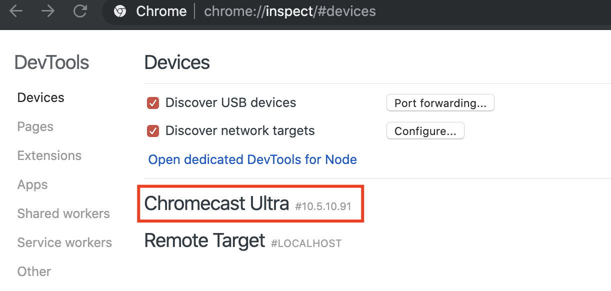 Put chrome://inspect/#devices into the address bar to find the IP of Chromecast. For instance,My Chromecast Ultra is at 10.5.10.91.