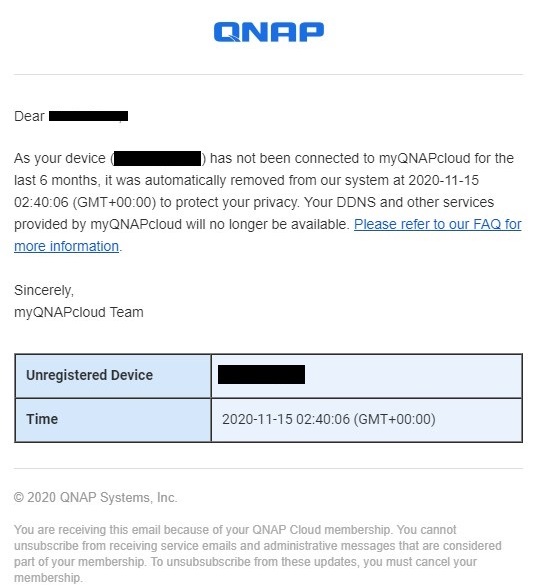 It is informed that his device named XXXXXX, has not connected to the myQNAPcloud for the last 6 months, so it was automatically removed, but what happens if the customer wish to reactivated, well in that case, you may try to login again using the myQNAPcloud account and same device name as used before, and if it is still available, then it will remain with the same name without problems, re-activating it.