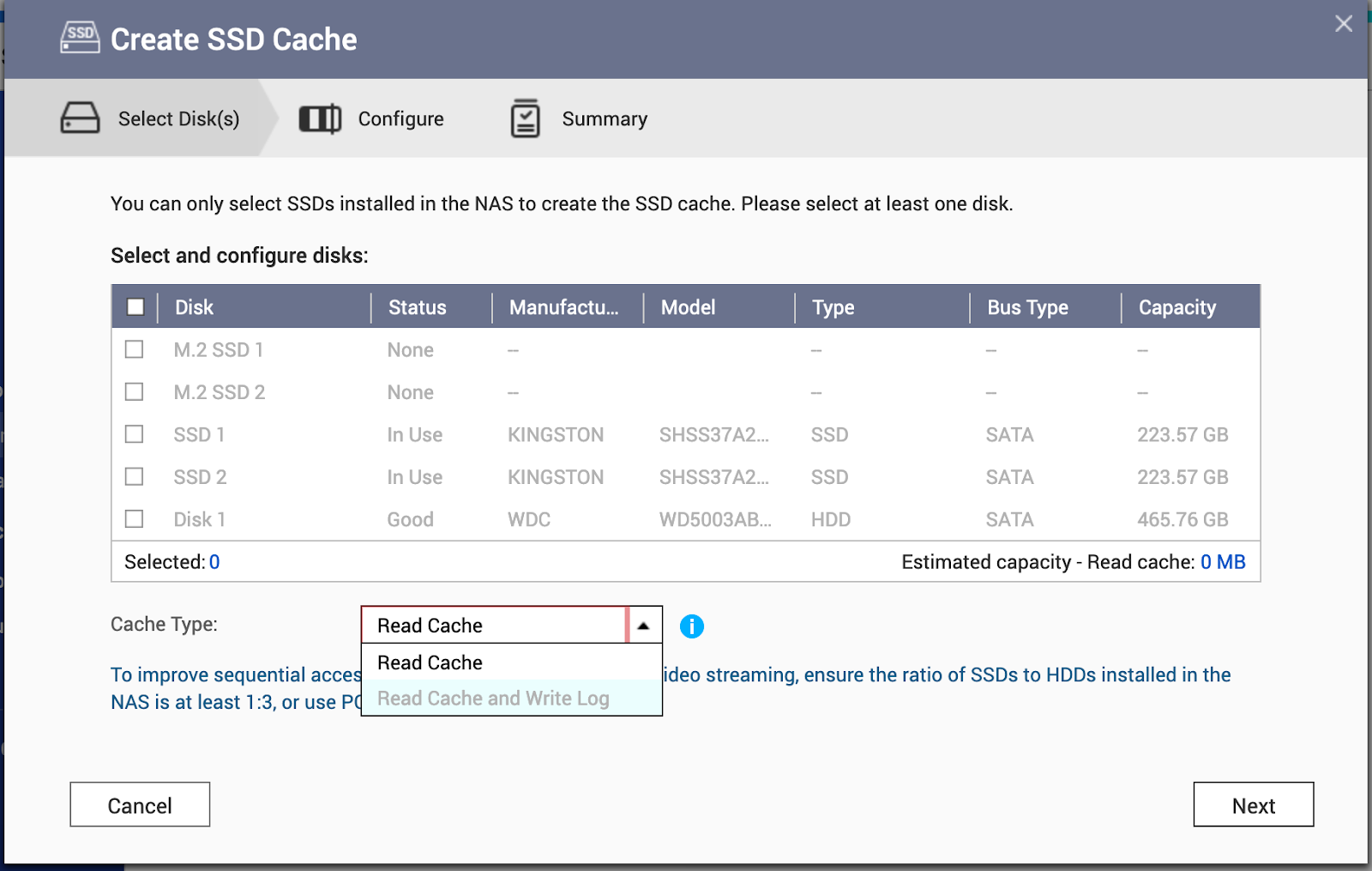 Note: If the cache type is set to Read Cache and Write Log, you must select an even number of disks.