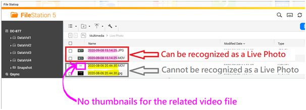 4. if there is no Live icon of the picture, please go to File Station of NAS web management interface. Go to the folder where the live photo is saved and check if there is a thumbnail of the video file that belongs to the Live Photo. Please refer to the picture below for examples.