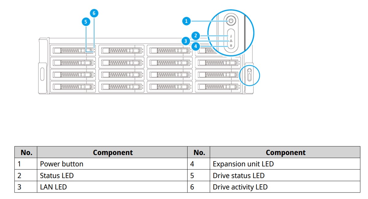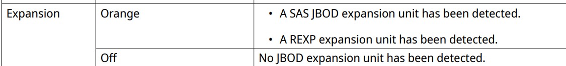When a SAS-based or REXP expansion unit is connected to a QNAP rack-mounted NAS, the expansion LED will remain lit. This behavior indicates a successful detection of the expansion unit and is not a system error.