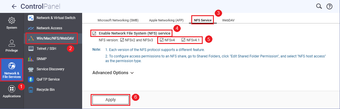- 转到网络和文件服务 > Win/Mac/NFS/WebDAV > NFS 服务。