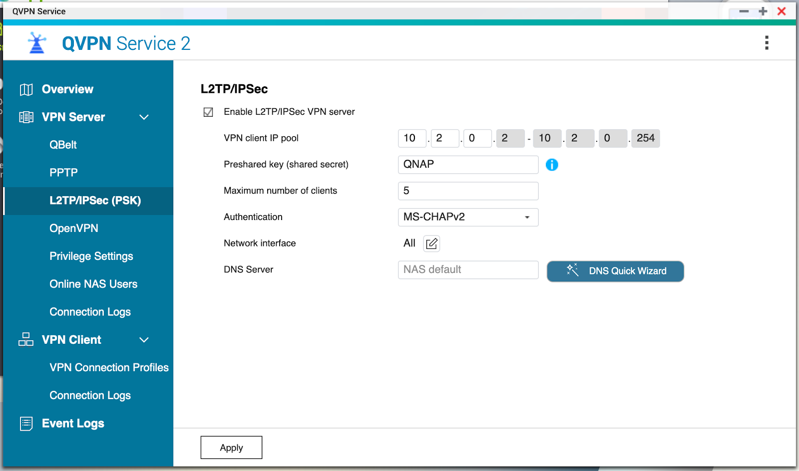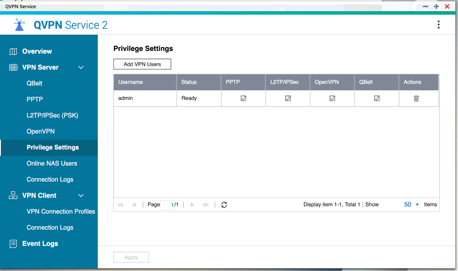 Under Privilege Settings you may grant permissions for NAS users to be able to use the VPN connection. Please make sure the checkbox under L2TP/IPSec is checked. If you are using PPTP or OpenVPN connection make sure those are enabled as well.