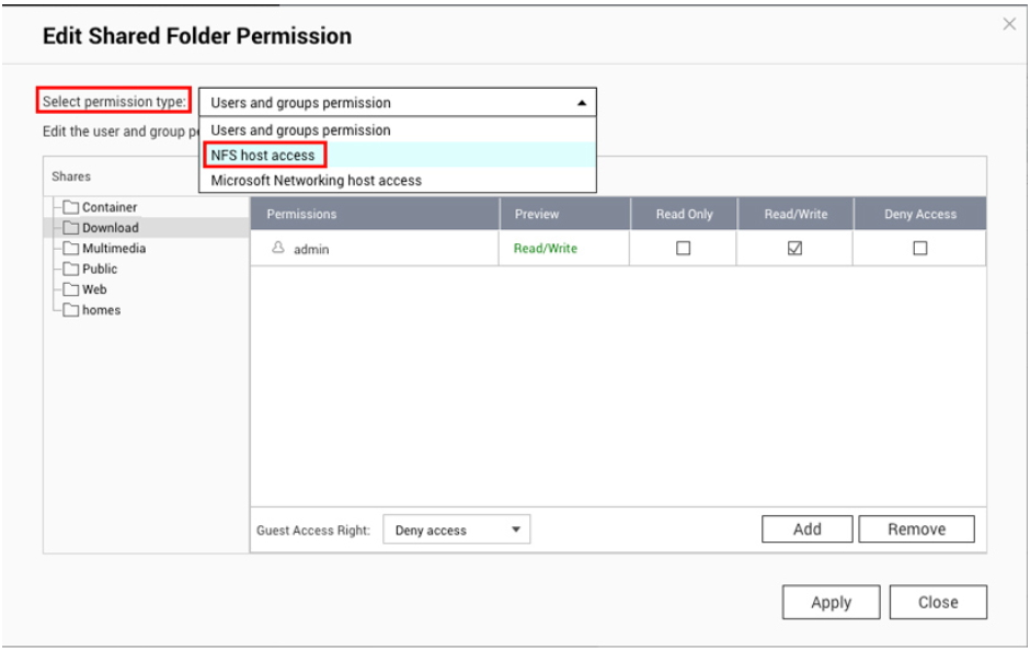 1. After the services have been enabled, follow the link “Click here to set the NFS access right of the network share”. You will be taken to the Shared Folders menu.