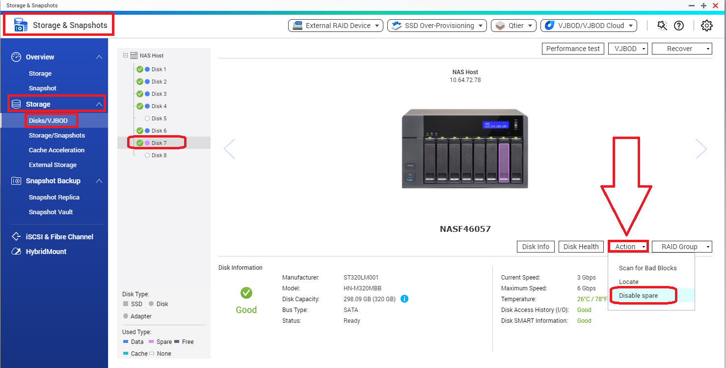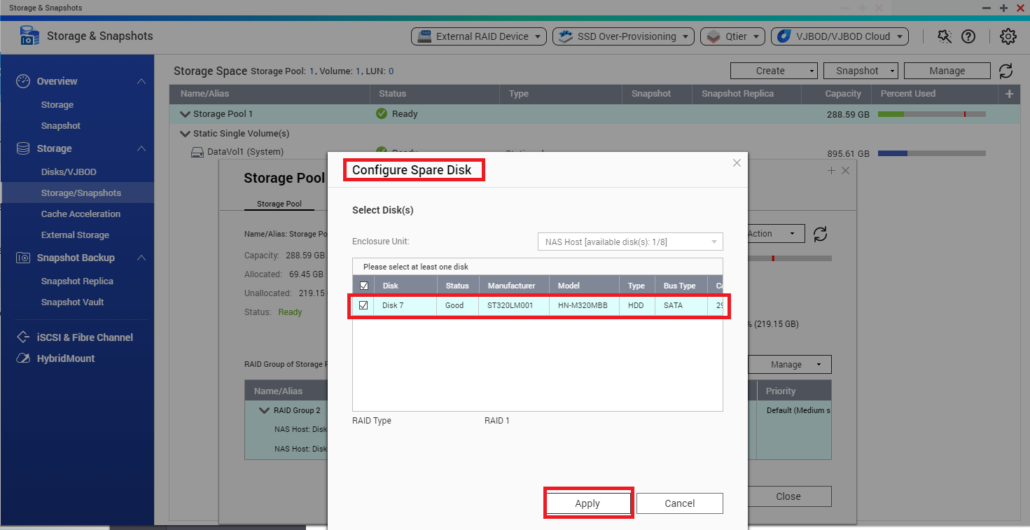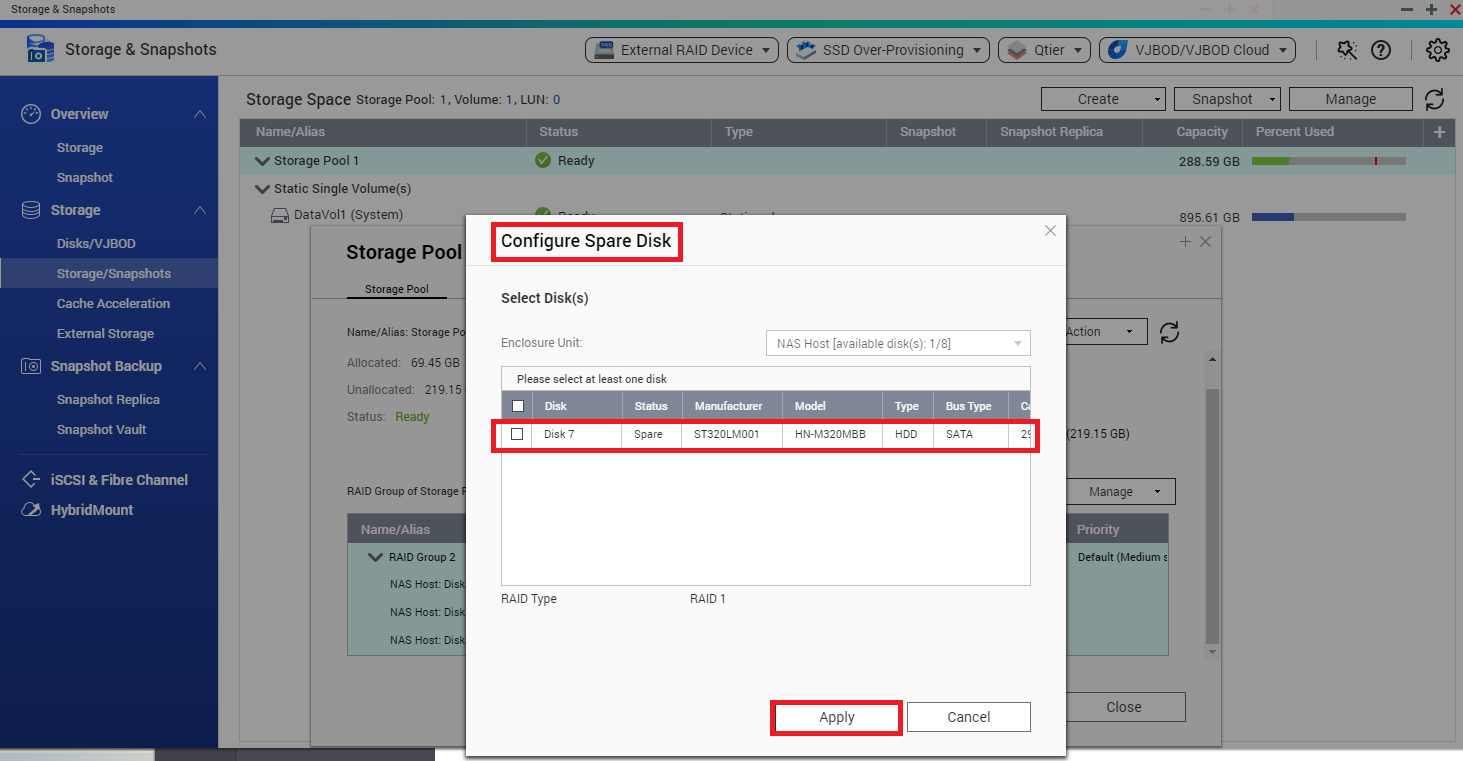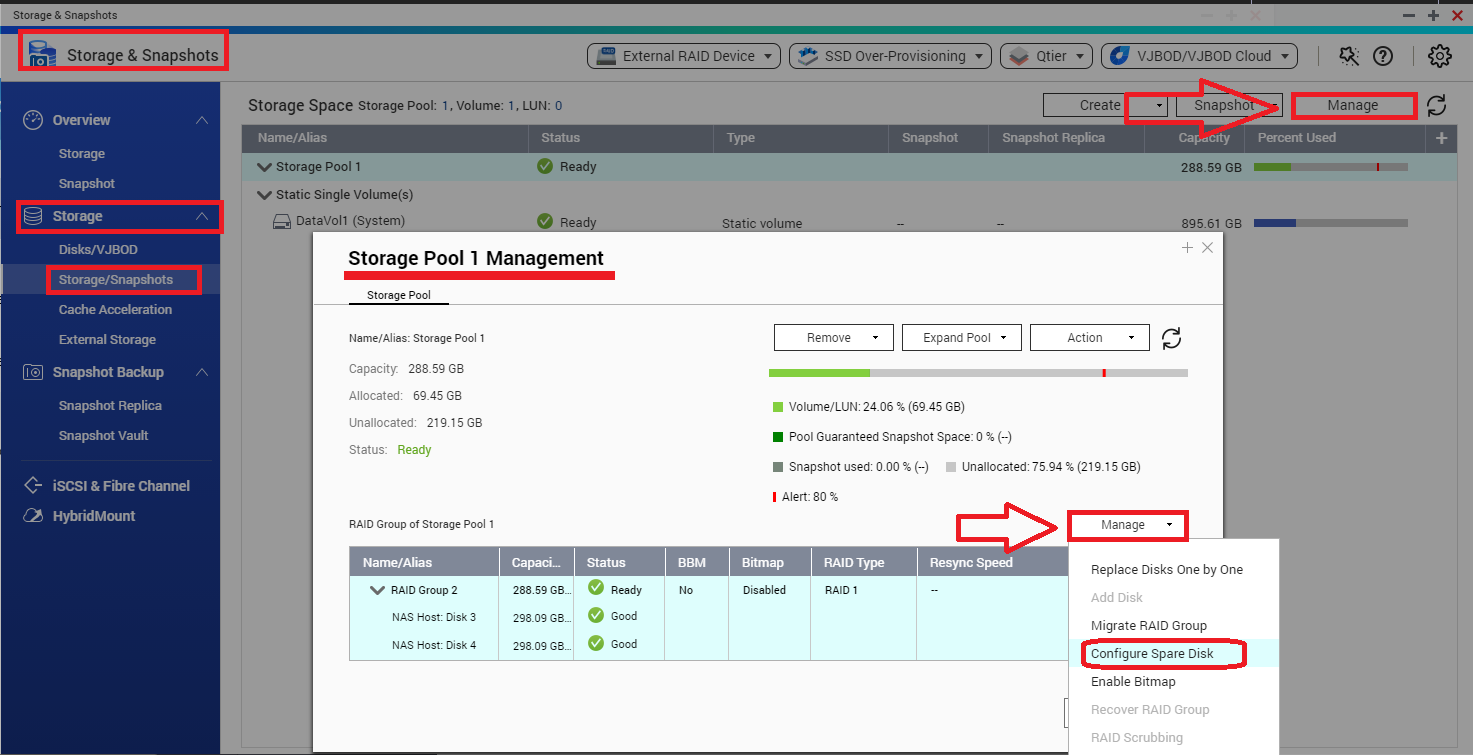 Select a RAID Group and click on “Manage” > “Configure Spare Disk”