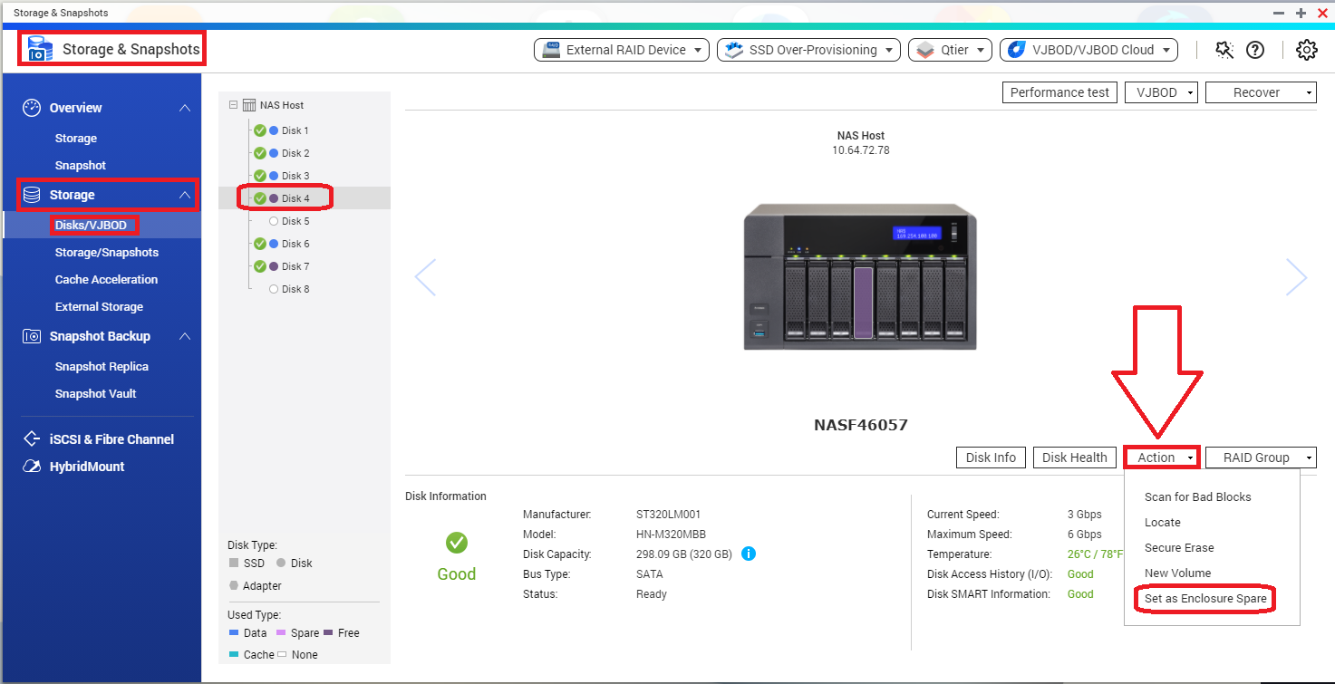 Click on “Action”, and then select “Set as Enclosure Spare”