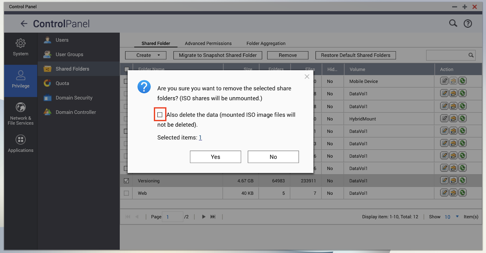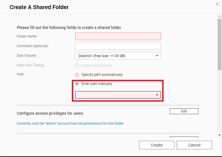To remove the data, you coils create a new shared folder linking to the “deleted” folder, then remove it again and with the above option checked to ensure the data is removed from the storage. To link the folder when creating the link, create a new shared folder from the NAS Control Panel > Privilege > Shared Folders > select “Create” then “Shared Folder”, Enter the “Folder Name”, select “Enter Path Manually” and select the “deleted” folder from the drop down menu, then click “Create”.