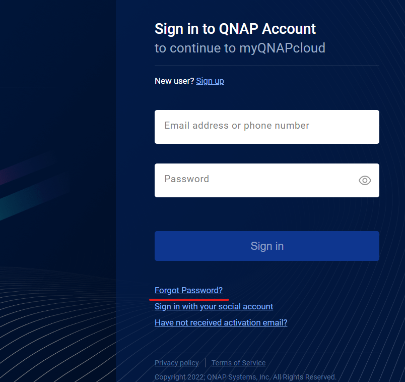 如果需要找回 QNAP ID 的密码,请使用 myQNAPcloud 登录页面上的“Forgot Password”(忘记密码)选项。