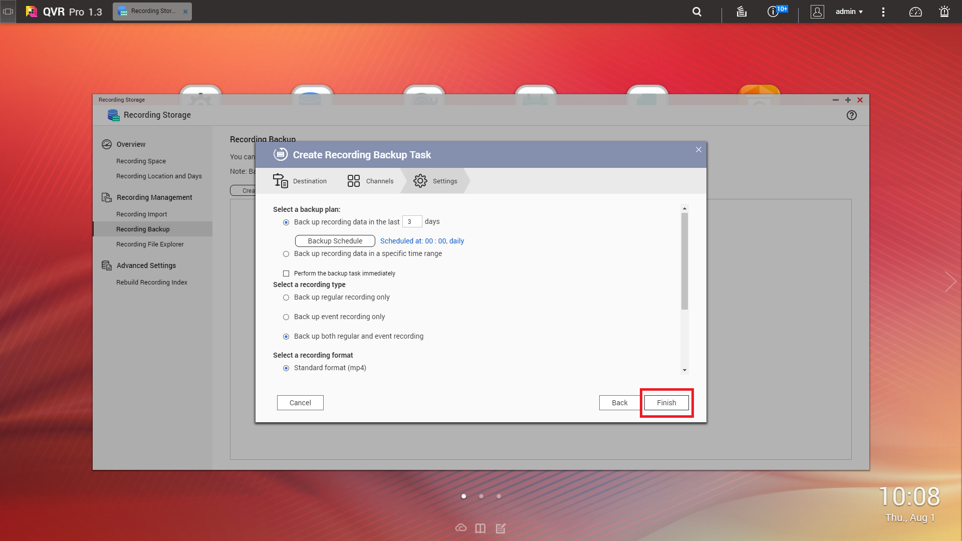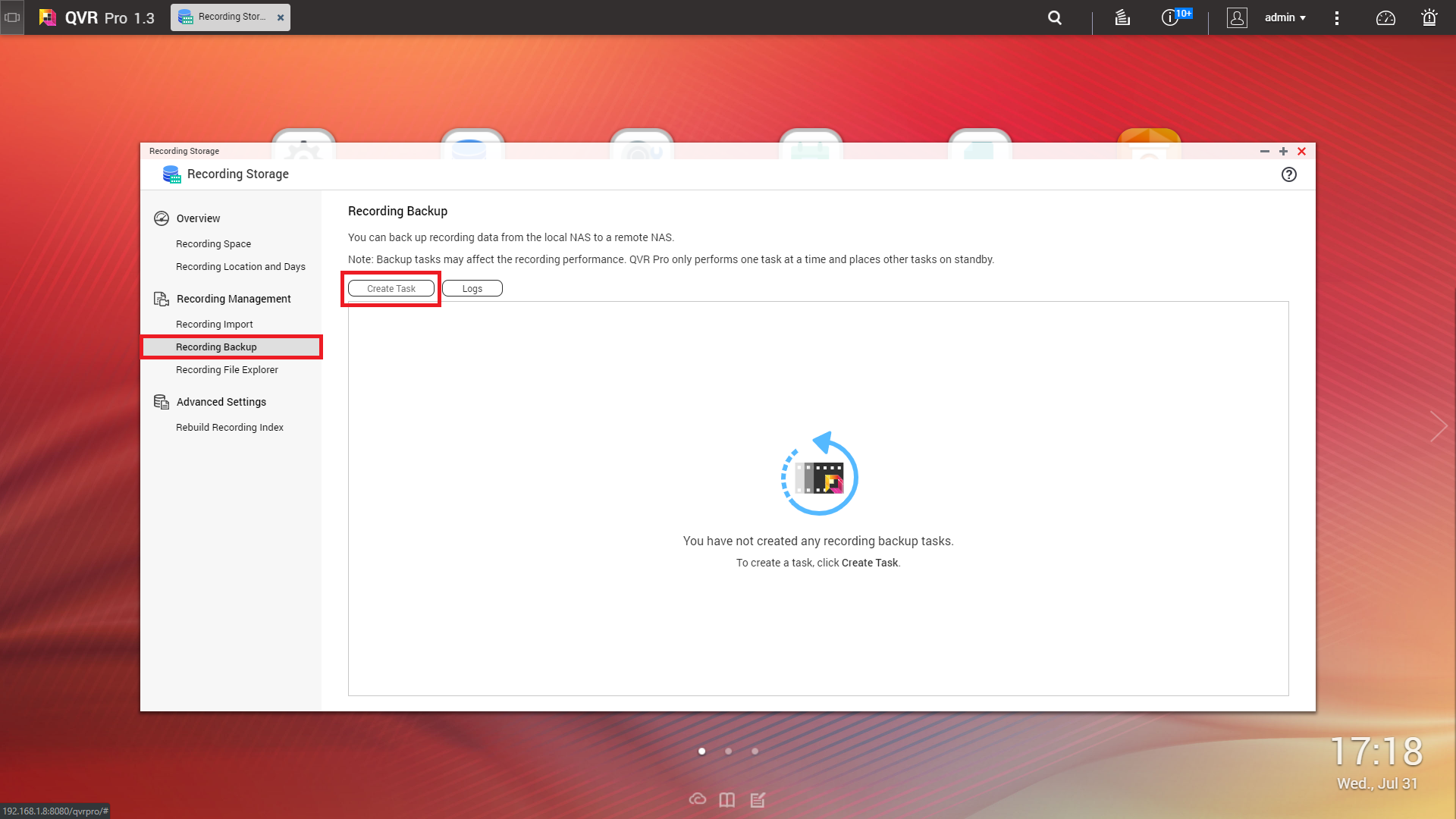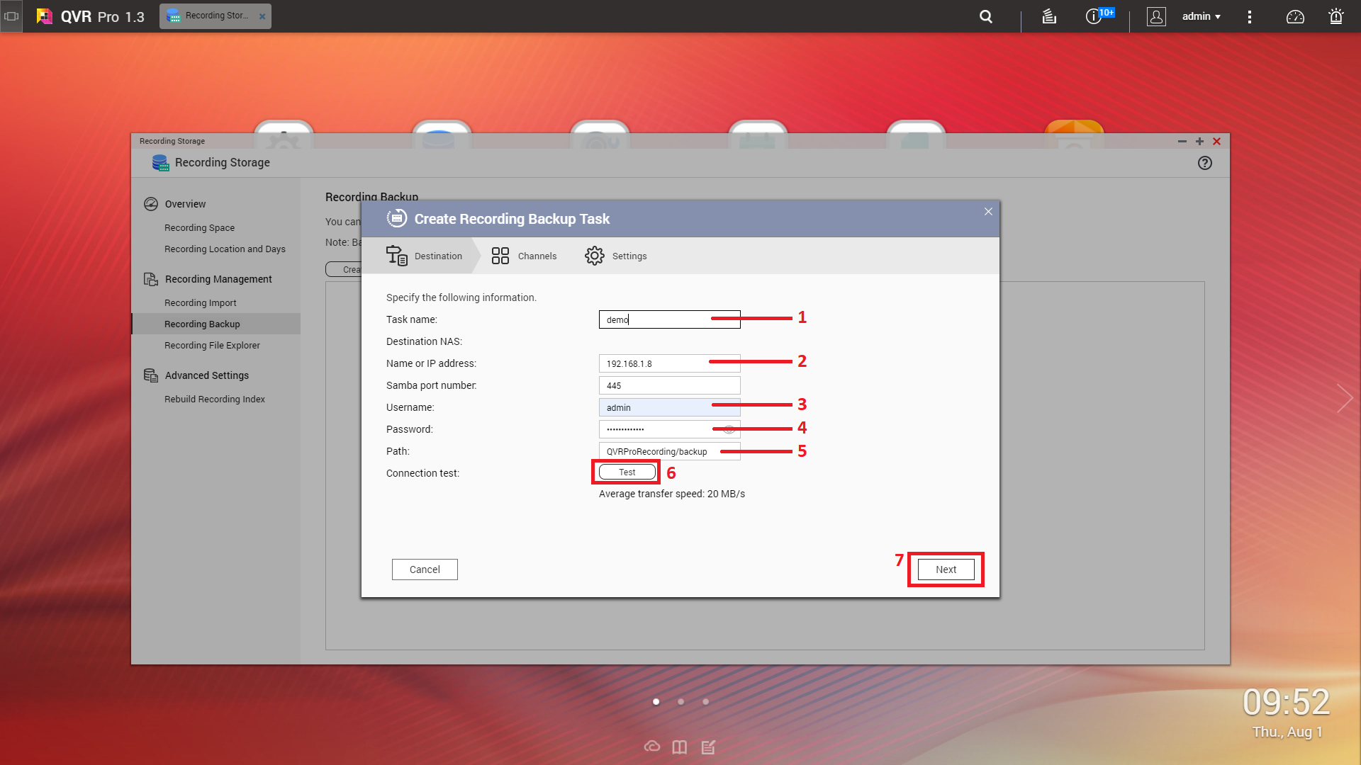 TutorialQVR Pro 备份 QVR Pro 录像 最后修订日期: 2020-01-07 开始之前: 转到“Recording Storage”(录像存储)>“Recording File Explorer”(录像文件资源管理器),然后选择“Use Recording File Explorer to access recordings”(使用录像文件资源管理器访问录像)。 为导出文件夹禁用“回收站”。 安装 QVR Pro 版本 1.3 或更高版本。 QVR Pro 可用于将录像备份到其他 NAS,设置备份计划,并在目标空间已满时指定是停止录像还是覆盖较旧的文件。 在 QTS 上,打开 QVR Pro。 从桌面或主菜单打开“Recording Storage”(录像存储)。 转到“Recording Backup”(录像备份)。 单击“Create Task”(创建任务)。 为目标 NAS 指定以下信息。 字段 操作 Task name(任务名称) 指定备份任务的名称。 注意: 名称要求: 长度:1-64 个字符。 有效字符:A-Z、a-z、0-9 有效特殊字符:空格 ( )、连字符 (-)、下划线 (_) 和句点 (.)。 Name or IP address(名称或 IP 地址) 指定目标 NAS 的名称或 IP 地址。 Port number(端口号) 指定连接的端口号。 Username(用户名) 指定目标 NAS 的用户名。 Password(密码) 指定密码。 Path(路径) 指定备份录像数据的路径。 可选:单击“Test”(测试)。 QVR Pro 会尝试使用指定的凭据连接到目标 NAS,然后显示测试结果。 单击“Next”(下一步)。 从频道列表中选择摄像头频道。 单击“Next”(下一步)。 选择以下备份计划之一。 计划 操作 备份最近几天的录像数据 选择“Back up recording data in the last few days”(备份过去几天的录像数据)。 指定天数。 备份特定时间范围内的录像数据 选择“Back up recording data in a specific time range”(备份特定时间范围内的录像数据)。 指定开始时间和结束时间。 指定备份计划。 注意: 您以后将无法返回此屏幕。如果需要修改备份计划,必须现在进行。 单击“Backup Schedule”(备份计划)。 此时会出现“Backup Schedule”(备份计划)窗口。 选择其中一个计划选项。 指定备份时间或每次备份之间的间隔。 单击“Apply”(应用)。 可选:选择“Perform the backup task immediately”(立即执行备份任务)。 选择一个录像类型。 Back up regular recording only(仅备份常规录像) Back up event recording only(仅备份事件录像) Back up both regular and event recording(备份常规和事件录像) 选择一种录像格式。 Standard format (mp4)(标准格式 (mp4)) QVR Pro 格式(可以导入到其他 QVR Pro 服务器) 注意: 如果您计划以后导入备份录像,必须选择 QVR Pro 格式。只能导入 QVI 格式的录像。 配置备份规则。 可选:指定录像数据的保留期。 指定目标空间已满时的存储策略。 单击“Finish”(完成)。 QVR Pro 会创建录像备份任务。您可以查看和管理任务列表上的任务。 这篇文章有帮助吗? 是 否 100% 的人认为有帮助。 谢谢您,我们已经收到您的意见。 请告诉我们如何改进这篇文章: 这篇文章缺了重点讯息 这篇文章的解决方案没有用 这篇文章太过复杂 这篇文章包含了不正确的讯息 这篇文章的信息已过时 如果您想提供其他意见,请于下方输入。 如果您想提供其他意见,请于下方输入。