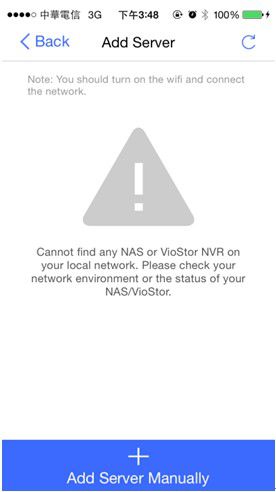 如果您搜寻不到Turbo NAS或VioStor NVR,请确认机器或网络联机状态。 您也可选择〔手动新增服务器〕来加入您的Turbo NAS或VioStor NVR。