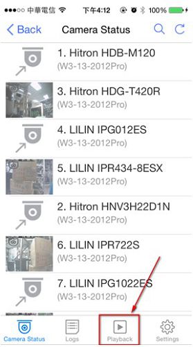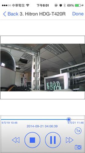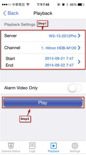选择服务器、摄影机、及开始和结束时间,接着选择〔回放〕。