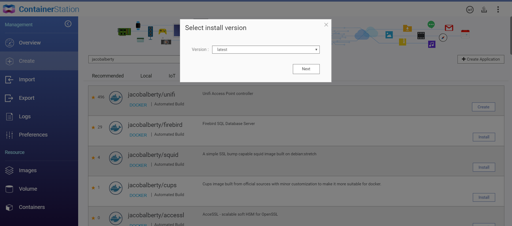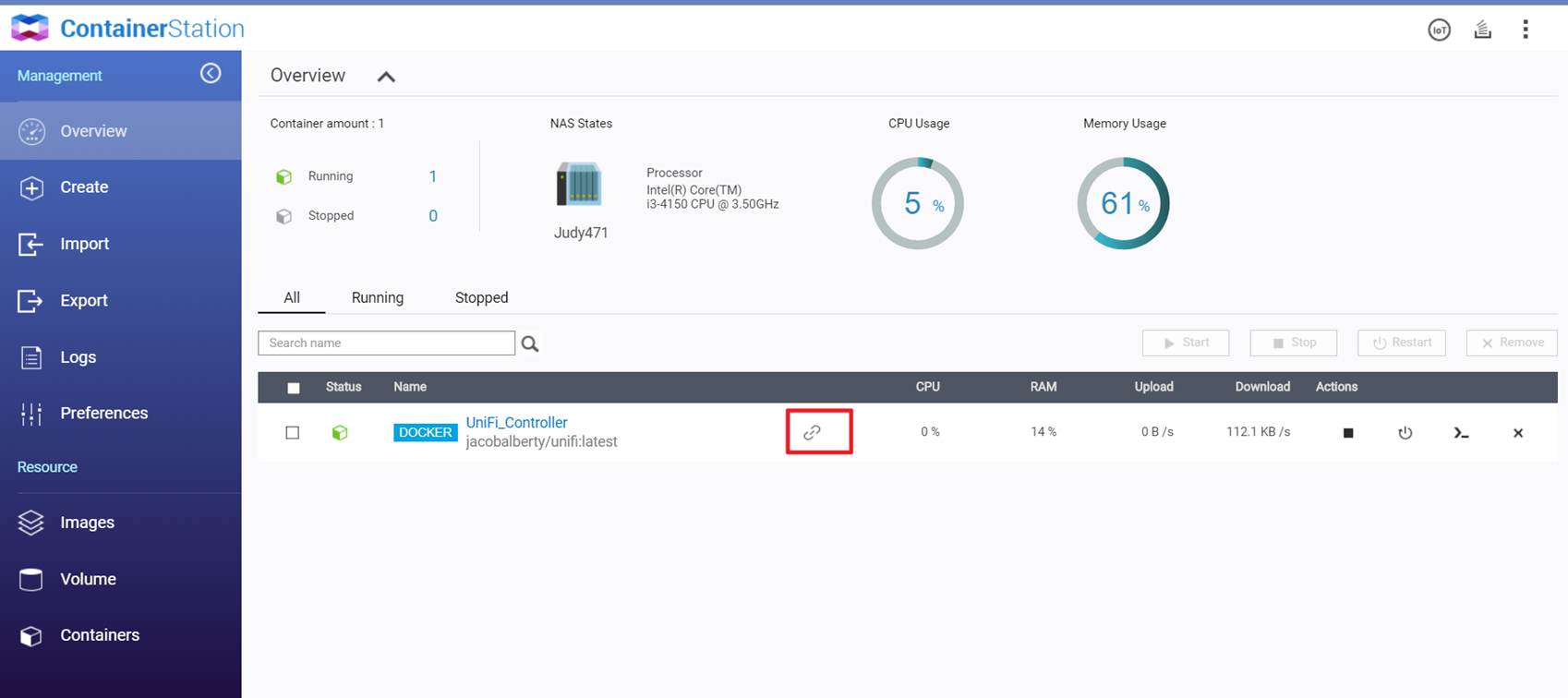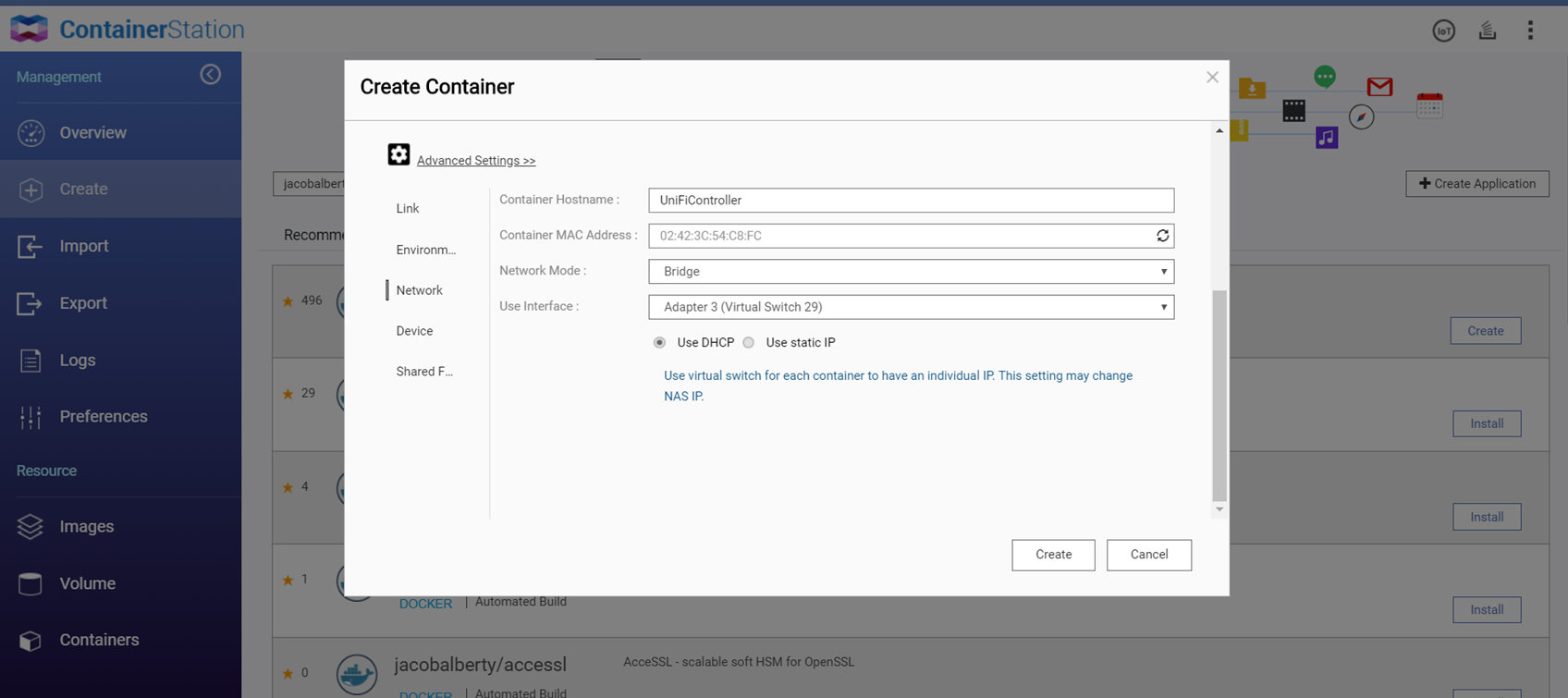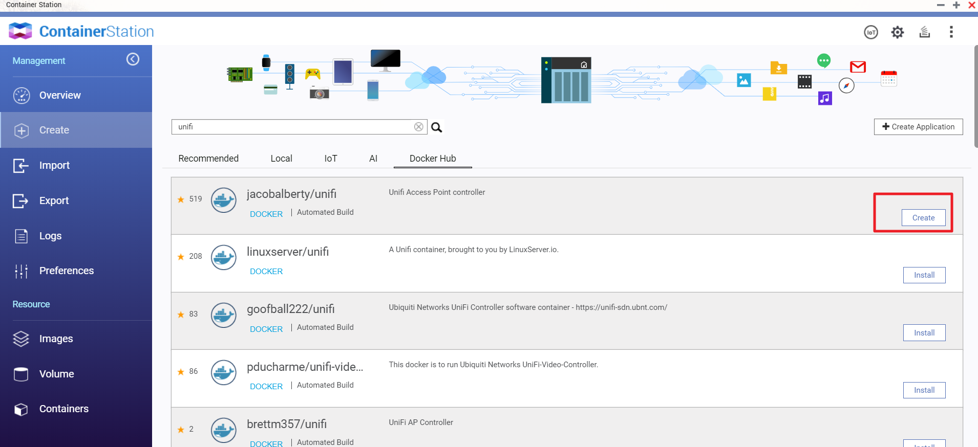 - 打开 Container Station,转到“Create”(创建)页面然后搜索“UniFi”。