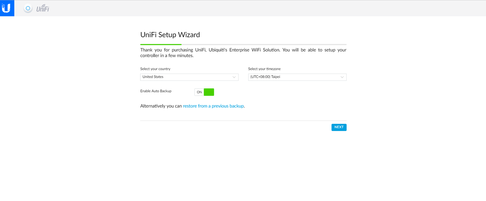 - 转到“Overview”(概览)页面,然后打开 UniFi_Controller 容器。随后将启动“UniFi Setup Wizard”(UniFi 安装向导)。