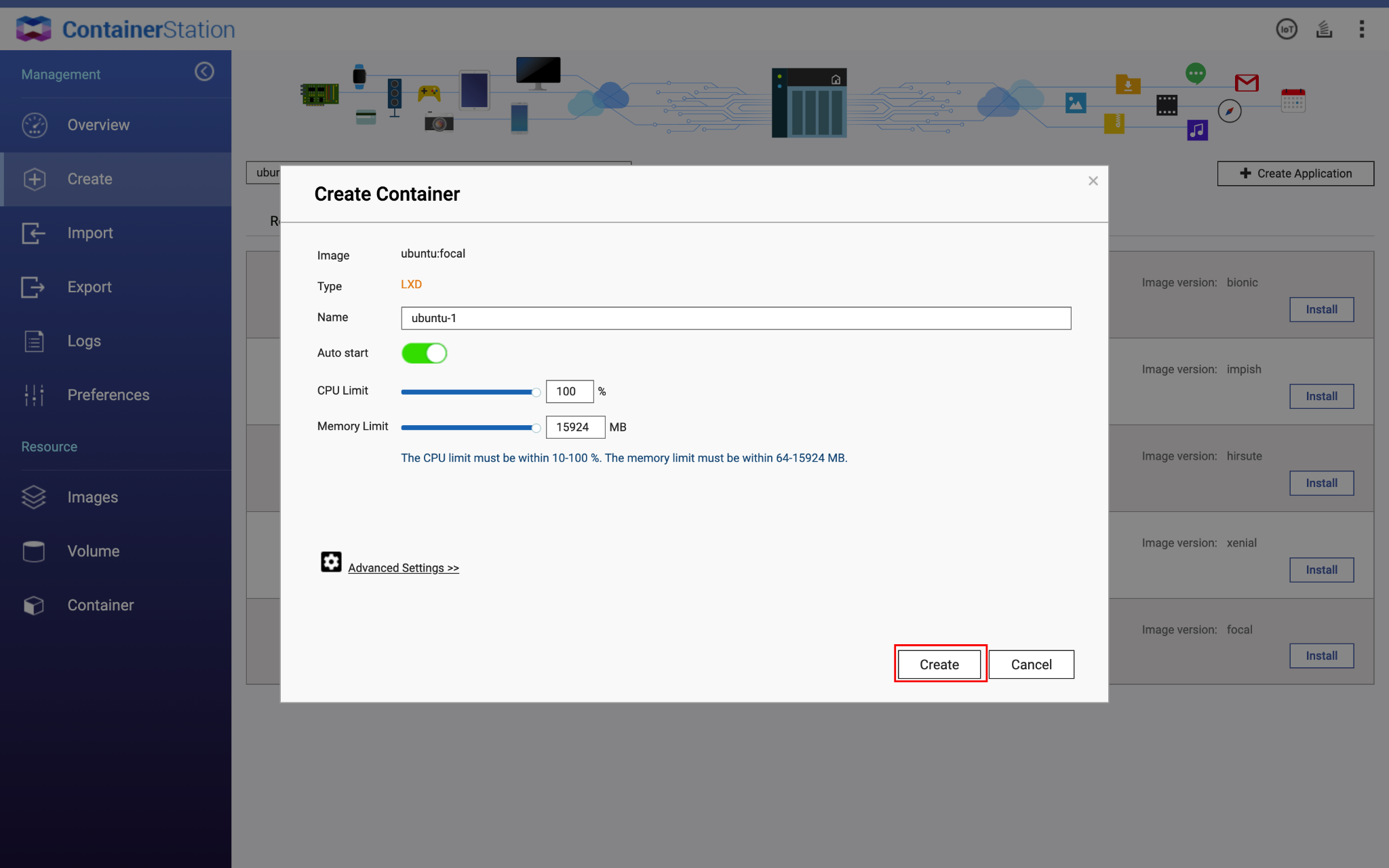 7. 在“Create Container”(创建容器)窗口中,输入一个名称,并为 LXD 容器分配 CPU 和内存资源。