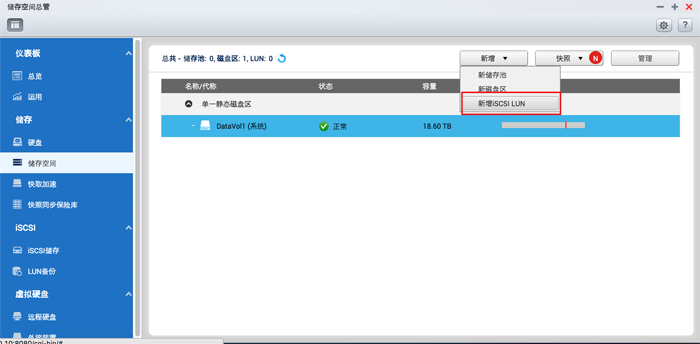 1. 以admin权限登入NAS,前往[储存空间总管]>[储存空间]>[新增]>[新增iSCSI LUN]。