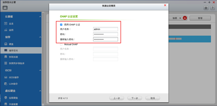 4. 建立账号密码。当NAS是位于公共场合或共享网络下时,建议您启用账号密码。但若不打算建立账号密码,则可略过此步骤。