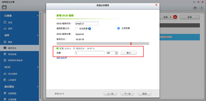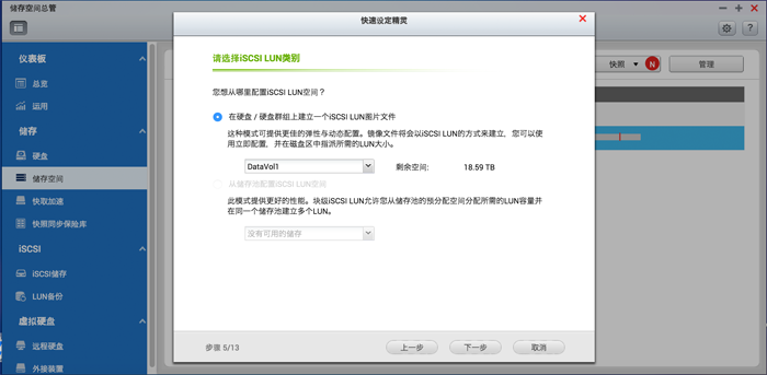 5. 选择要建立映像档还是预先替iSCSI LUN配置空间。前者较为弹性,后者则效能较佳。