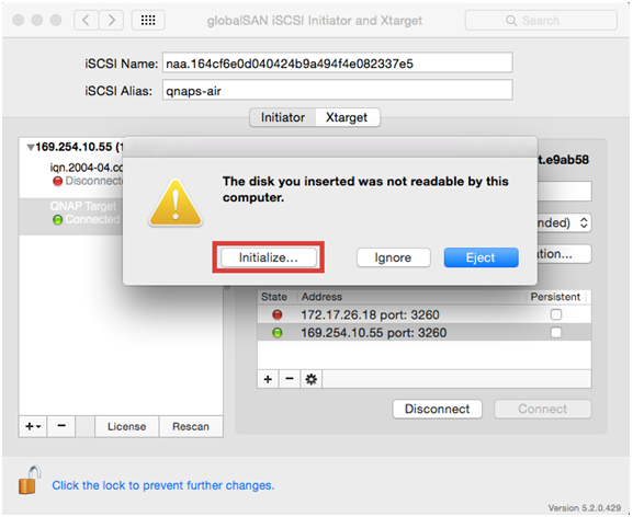4. 当您先一步次连接iSCSI目标时,系统会显示一个对话框来提醒您磁盘尚未格式化,点选[Initialize…]来格式化磁盘。