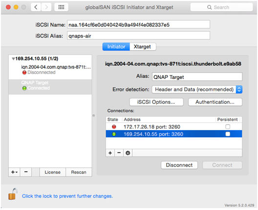 globalSAN initiator是专为Mac操作系统设计的iSCSI initiator(系统需为Mac OS X 10.4或以后版本)。用户可通过globalSAN initiator的接口连接至iSCSI 目标。关于软件的详细数据,请参考:http://www.studionetworksolutions.com/globalsan-iscsi-initiator/.