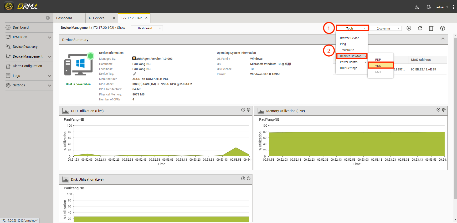 按照以下步骤在 QRM+ 中使用 VNC 访问远程桌面:
